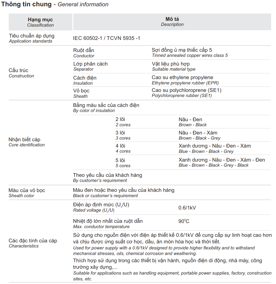 0.6/1kV Cáp Mềm Cách Điện EPR & Vỏ Bọc polychloropren (PNCT)